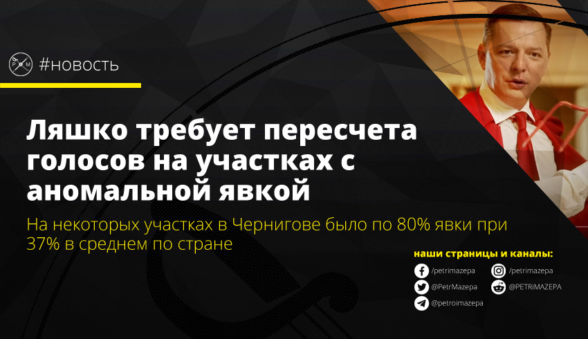 Также кандидат в нардепы указывает на аномально высокую явку - на ряде участков проголосовали 80% избирателей, когда по всей стране показатель - 30%-40%. Олег Ляшко обратился к членам УИК и ОИК с требованием обеспечить честный подсчет голосов и провести перерасчет их на участках с аномально высокой явкой. А к правоохранителям (Нацполиции и прокуратуре) обратился с требованием начать расследование фальсификаций и «каруселей», хотя сам же заявил, что подвоз голосующих контролировали силовики.