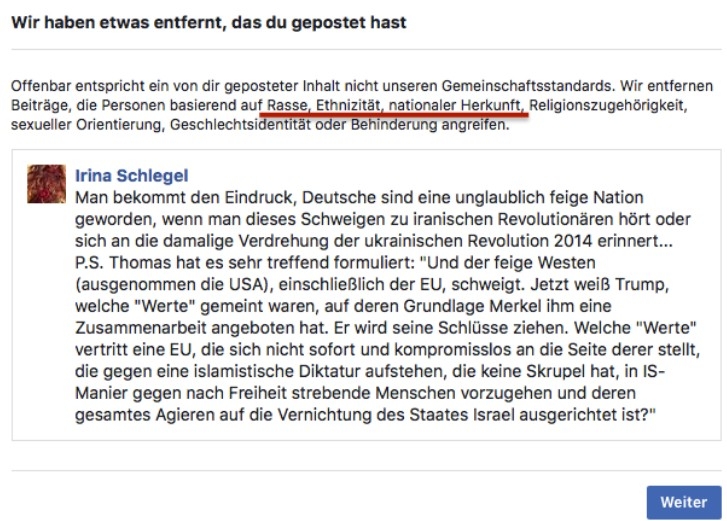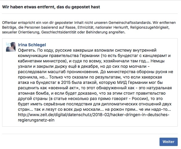 А в январе этого года Facebook неожиданно заблокировал меня уже на три дня за пост на картинке справа. Очевидно, за его первое предложение, где написано: «Когда слышишь это молчание по поводу иранской революции или вспоминаешь всё то извращение украинской революции 2014 года, создаётся впечатление, что немцы стали невероятно трусливой нацией». Facebook решил обвинить меня в нападках на людей «по признаку их национального происхождения» (при этом я сама — немка). И такой вердикт система вынесла всего лишь на основании слов «создаётся впечатление, что немцы стали трусливой нацией».