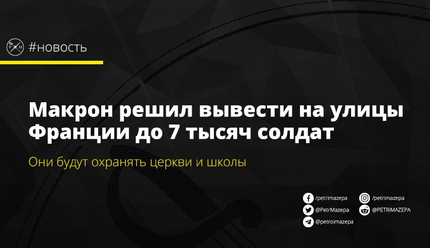 На улицы Франции выйдут от 3 до 7 тысяч солдат для защиты ключевых объектов, таких как церкви и школы, цитирует Макрона BFM.