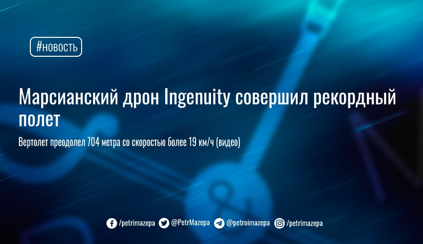 Дрон NASA на Марсе Ingenuity снял видео рекордного по расстоянию полета. Сам полет состоялся 8 апреля, он был 25-м с начала миссии. Вертолет преодолел 704 метра со скоростью более 19 км/ч.