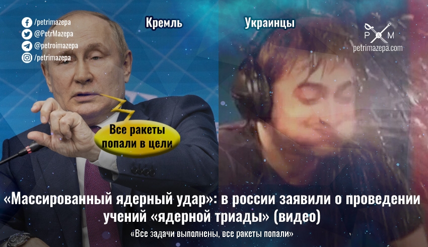 В россии заявили о проведении учений с отработкой нанесения массированного ядерного удара — руководил ими якобы лично путин, а в учениях участвовала вся «ядерная триада» россии. Удар был нанесен по полигону на Камчатке.