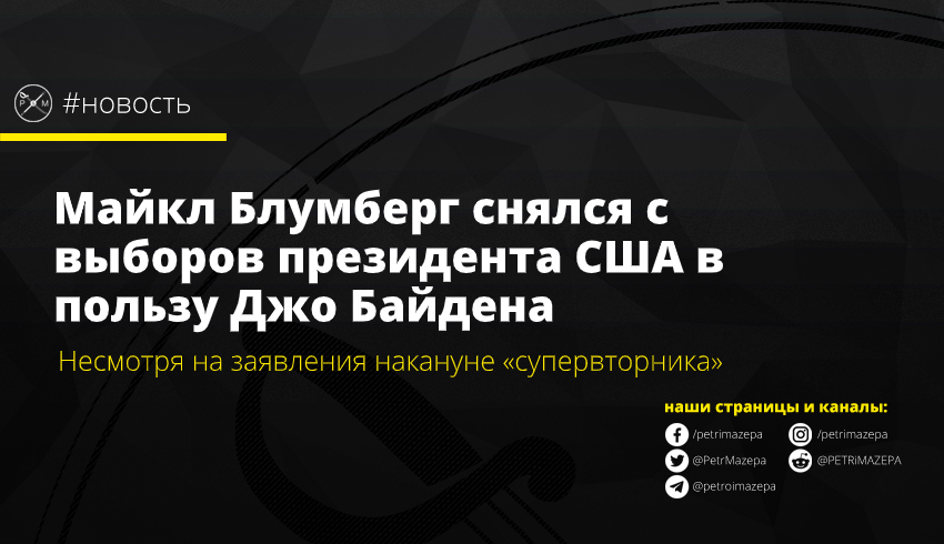 Кандидат в президенты США Майкл Блумберг принял решение снять свою кандидатуру в пользу другого кандидата, лидера праймериз демократической партии на данный момент, Джо Байдена.