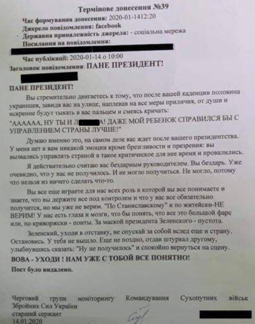 «Установлено, что в результате низкого уровня дисциплины и ненадлежащего соблюдения требований уставов ВСУ офицер отдела информационного противодействия оперативного управления штаба Командования Сухопутных войск ВСУ 14 января 2020 опубликовал на своей странице в соцсети Facebook сообщение негативного характера в адрес президента Украины Владимира Зеленского, в котором выразил недовольство результатам работы президента на занимаемой должности с призывом покинуть пост», - говорится в приказе, фото которого опубликовал в сети участник боевых действий Александр Погребиський.