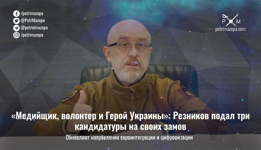 Министр обороны Алексей Резников сообщил, что подал три кандидатуры на должности собственных заместителей — это Герой Украины, генерал-лейтенант Александр Павлюк, волонтер и журналист, основатель «Вернись живым» Виталий Дейнега и медийщик Андрей Шевченко, занимавший должности посла и нардепа в прошлом.