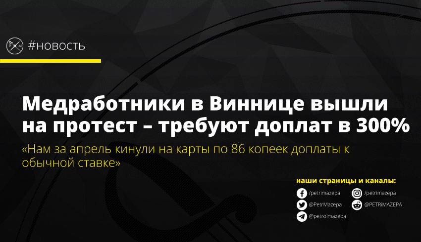 Весь коллектив районной Винницкой больницы вышел сегодня на акцию протеста – требуют от главврача больницы и руководства ОГА выполнения обещаний президента и главы МОЗ о выплате доплат. По словам медиков, несмотря на обещания властей, они получили менее 1-2 грн доплаты за апрель, хотя их больница работает с больными COVID-19.