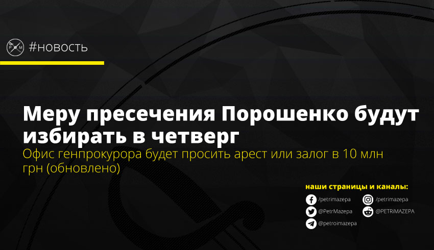 Офис Генерального прокурора будет ходатайствовать о выборе в качестве меры пресечения для Петра Порошенко ареста с альтернативой внесения залога в размере 10 млн грн, сообщает «Украинская правда» со ссылкой на официальный комментарий ОГП.