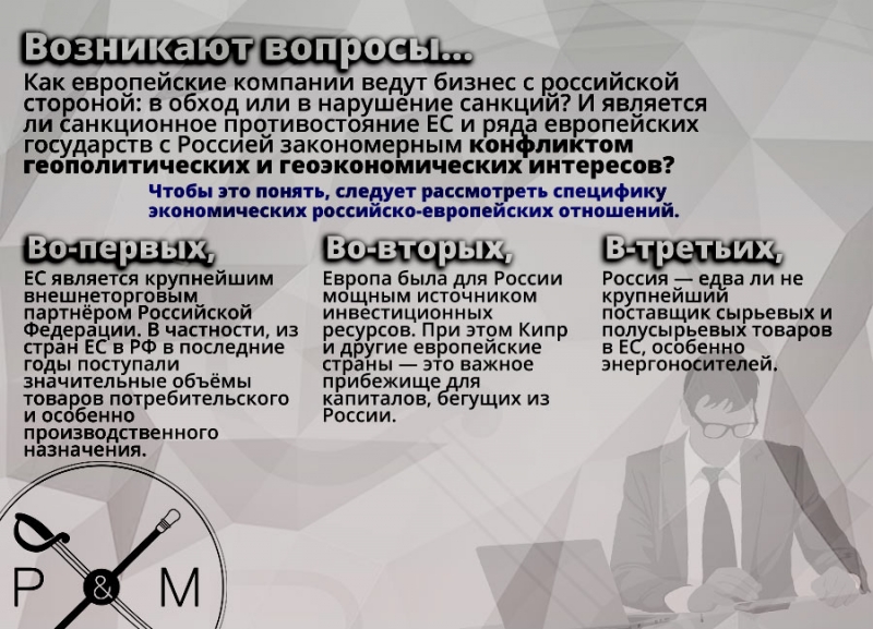 И соответственно возникают вопросы... Как европейские компании ведут бизнес с российской стороной: в обход или в нарушение санкций? И является ли санкционное противостояние ЕС и ряда европейских государств с Россией закономерным конфликтом геополитических и геоэкономических интересов?