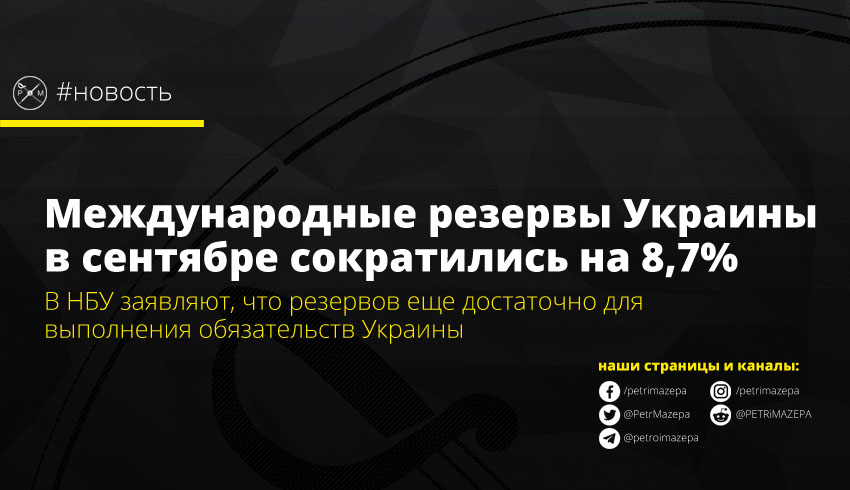По состоянию на 1 октября международные резервы Украины составляли 26,5 млрд долл США в эквиваленте, сообщает НБУ. За сентябрь они сократились на 8,7%, однако и сейчас объем международных резервов Украины достаточен для выполнения обязательств Украины и текущих операций.