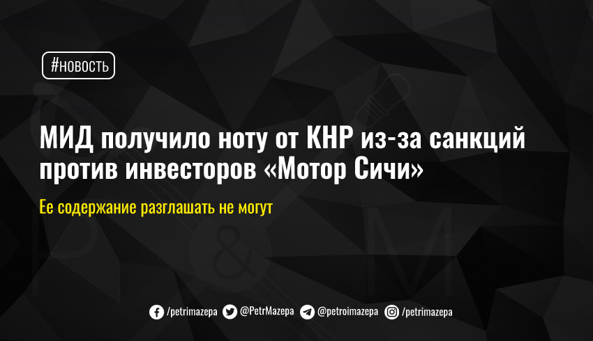 Министерство иностранных дел Украины получило от Китая ноту в связи с введением Украиной санкций против китайских акционеров «Мотор Сичи».