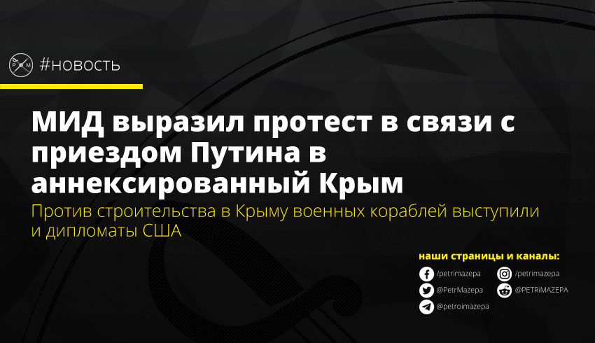Министерство иностранных дел Украины заявило о решительном протесте в связи с визитом в Крым президента страны-агрессора Владимира Путина. МИД подчеркивает, что этот визит нарушает резолюции ООН и ПА ОБСЕ, а также в очередной раз демонстрирует игнорирование РФ норм международного права.