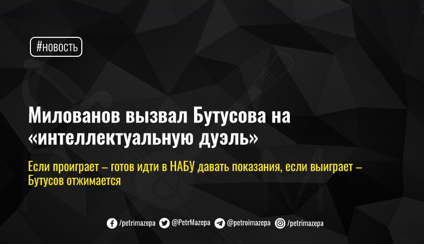 Тимофей «Дебил» Милованов написал, что раньше за такое вызывали на дуэль, но сейчас у нас времена «вегетарианские», поэтому дуэль будет интеллектуальной. Дебаты он предлагает проводить «по правилам зеркальным правилам дуэлей 19-го столетия». И в случае выигрыша Бутусова готов пойти с ним в НАБУ и после того, как журналист напишет заявление, дать показания. А в случае проигрыша Бутусова – тот «на камеры отжимается от пола (чисто без рисования) 20 раз и громко говорит "Я крикуха і еропка"».