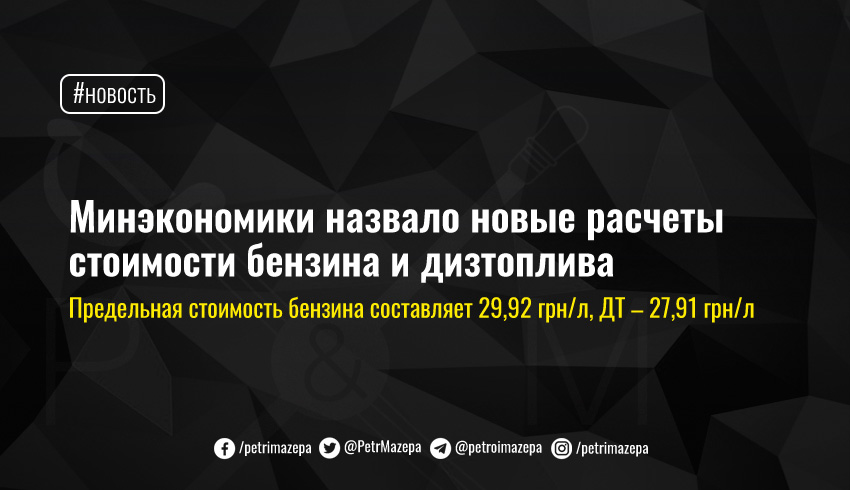 На основании расчетов НАК «Нафтогаз Украины» определена средняя стоимость 1 литра дизельного топлива ULSD 10 ppm, которая составляет 20,91 грн, и 1 литра бензина автомобильного GASOLINE 10 ppm, которая составляет 24,92 грн за литр, передает пресс-центр Минэкономики.