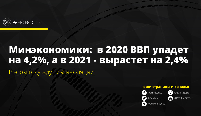 В 2020 году ВВП Украины упадет на 4,2%, а инфляция ускорится до 7% (в расчете декабрь к декабрю предыдущего года). При этом по прогнозам Минэкономики, в 2021 году экономический рост возобновится.