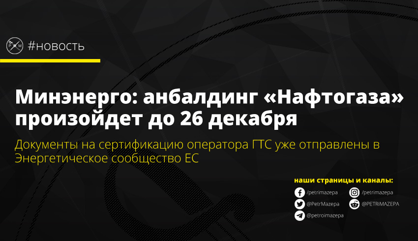 Окончательное завершение процедуры отделения газотранспортной системы (ГТС) Украины от должно произойти до 26 декабря текущего года. Документы по сертификации оператора ГТС отправлены в Энергетическое сообщество ЕС. В ближайшее время ожидается согласование от европейского регулятора.
