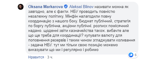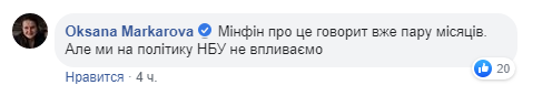 В комментариях к посту Сульжика министр финансов Оксана Маркарова отметила, что «Минфин про это говорит уже пару месяцев, но мы на политику НБУ не влияем».