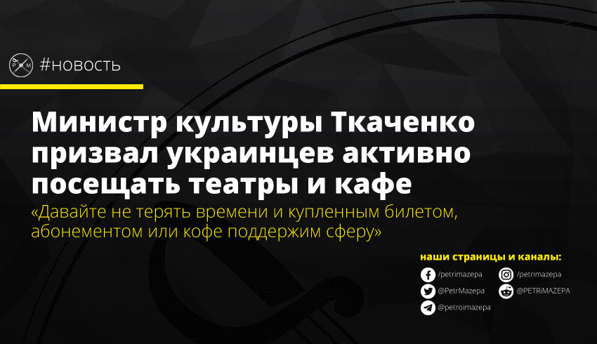 Глава Министерства культуры и информационной политики Украины Александр Ткаченко призвал украинцев активнее посещать музеи, филармонии, театры, кафе и рестораны, чтобы поддержать сферу после карантина.