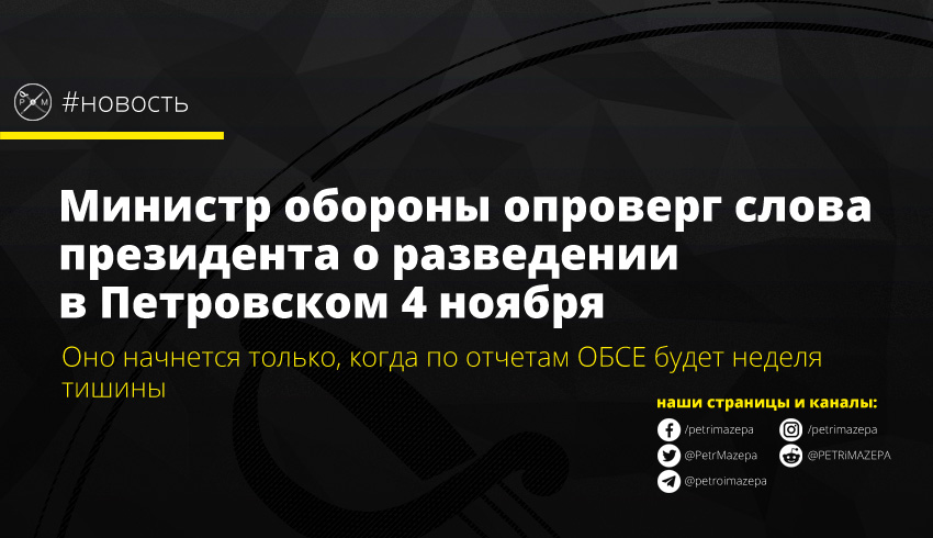 На вопрос журналиста, как может быть разведение анонсировано на 4 ноября, когда 29 октября СММ ОБСЕ фиксировало обстрелы в зоне разведения, министр ответил, что сроки будут пересмотрены. Он подтвердил, что для Петровского действуют те же условия для начала разведения сил и средств, которые применяли ранее в Золотом – неделя тишины по отчетам СММ ОБСЕ.