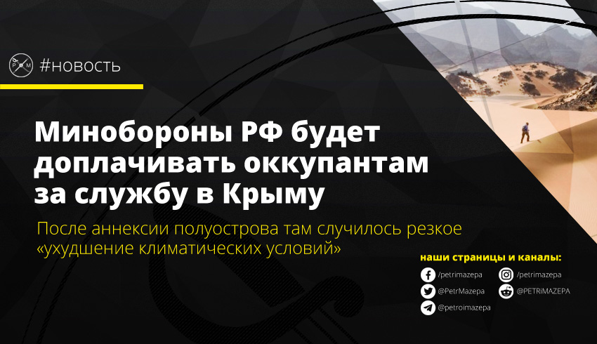 Минобороны страны-агрессора планирует доплачивать 10% контрактникам в аннексированном Крыму. Причина такой инициативы – «ухудшение климатических условий и обострение экологической обстановки в местах дислокации воинских частей». Таковы последствия аннексии, когда Украина, на которую напали россияне, перестала поставлять воду в Крым.