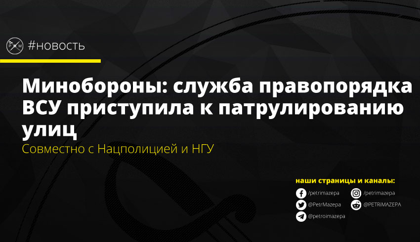В рамках проведения ограничительно-карантинных мероприятий с сегодняшнего дня Военная служба правопорядка ВСУ приступила к совместному патрулированию улиц вместе с сотрудниками Нацполиции и военнослужащими Нацгвардии.