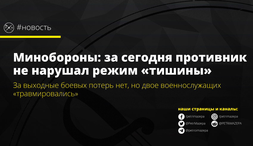 В Минобороны сообщили что сегодня российские оккупанты не нарушали режима «тишины», обстрелов не зафиксировано. За вчера было зафиксировано три «неприцельных» обстрела, боевых потерь нет, однако два военнослужащих травмированы, один с осколочным ранением.