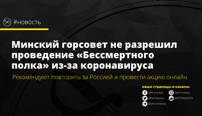 «В целях профилактики и минимизации распространения острых респираторных инфекций, в том числе вызванных COVID-19», Мингорисполком рекомендует воздержаться от массового мероприятия, передает tut.by. При этом, в своем ответе городские власти предлагают последовать примеру России, где акция «Бессмертный полк» пройдет в формате онлайн. Тем не менее, на 9 мая в Минске запланированы военный парад и концерт.