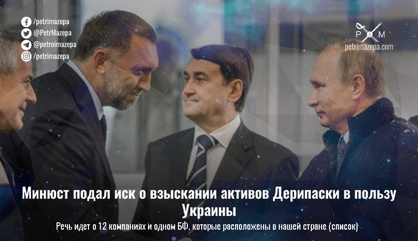 Министерство юстиции подало иск в Высший антикоррупционный суд о взыскании активов российского олигарха Олега Дерипаски в доход государства. Указывается, что Дерипаска является гражданином России, поддерживает путинский режим как минимум тем, что получает доход от правительства России и производства бронетехники, применяемой страной-агрессором в войне против Украины.