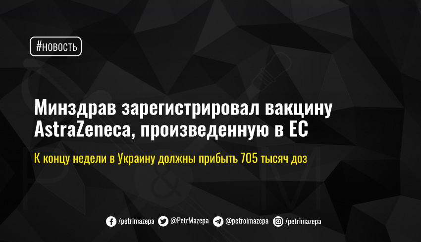 Министерство здравоохранения Украины зарегистрировало для экстренного медицинского применения вакцину против COVID-19 AstraZeneca, изготовленную в Европейском Союзе.