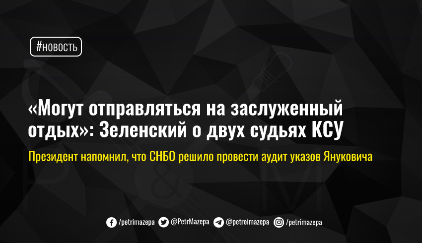 «На прошлом заседании СНБО, среди прочего, было принято решение касательно аудита всех указов Президента Януковича. Сегодня есть первые результаты. Речь про два указа Януковича – от 14 мая и 17 сентября 2013 года о назначении судьями Конституционного суда Тупицкого Александра Николаевича и Касминина Александра Владимировича. Оба эти указа мной отменены. Указанные лица могут отправляться на заслуженный отдых», - сообщил Зеленский.