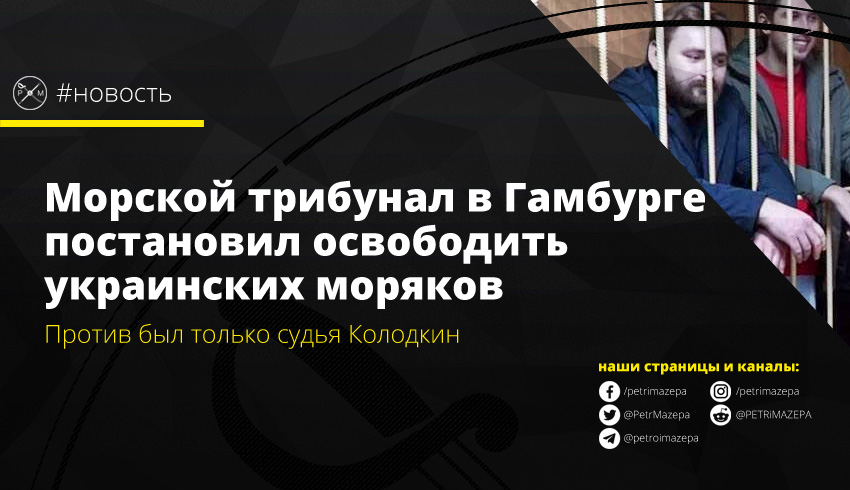 Международный трибунал по морскому праву в Гамбурге вынес свое решение по делу 24 украинских моряков и трех кораблей в пользу Украины. Против был только российский судья Колодкин (страна-агрессор их видимо по фамилиям отбирает).