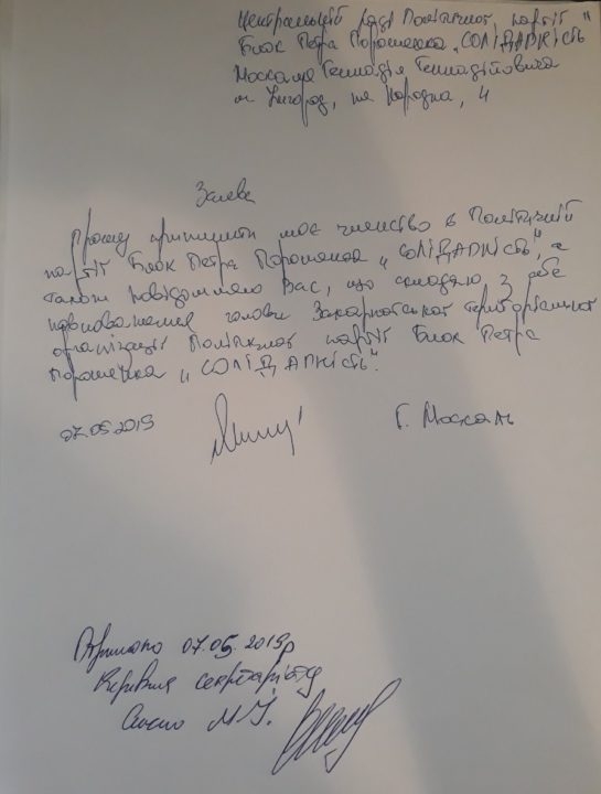 Геннадий Москаль написал заявление в Центральный совет политической партии Блок Петра Порошенка «Солидарность» про выход из партии, и сложил с себя полномочия главы Закарпатской территориальной организации этой партии.
