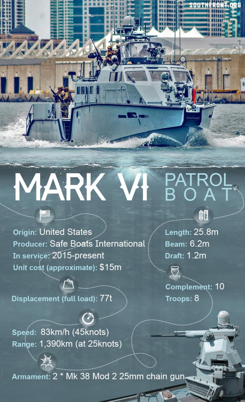 «Mark VI» — 25-метровый многоцелевой алюминиевый катер, способный работать в прибрежной полосе, устьях рек и на мелководье, но с запасом хода и мореходностью достаточной, чтобы перекрыть весь Черноморский и Азовский регион. 600 миль без дозаправки, 35 узлов скорости. Вооружение — 4 крепления под 25-30 мм орудия с тепловизорами, способные обстреливать 4 разные цели с удалённым управлением из кабины, точки под пулемёты и 40-мм гранатомёты.