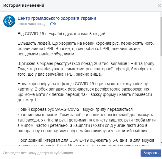 В обнародованной Центром общественного здоровья было упомянуто, что в Черновицкой области 1 летальный случай и «8 выздоровели». На данный момент публикация удалена, однако сохранена история правок публикаций.