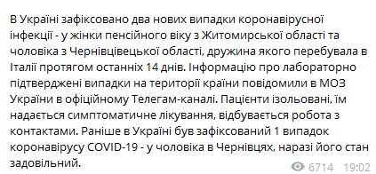 Об этом сообщило Министерство здравоохранения в своем Telegram-канале о коронавирусе. Речь идет о мужчине из Черновицкой области, жена которого находилась в Италии в период последних 14 дней, а также про женщину пенсионного возраста из Житомирской области. «Пациенты изолированы, им предоставляется симптоматическое лечение, проводится работа с контактами. Ранее в Украине был зафиксирован 1 случай коронавируса COVID-19 - у мужчины в Черновцах, сейчас его состояние удовлетворительное», - написали представители МОЗ.