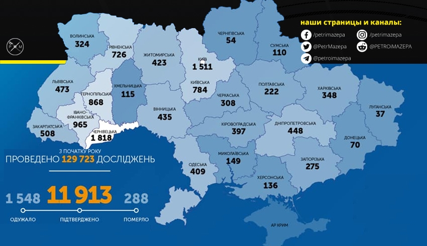 По данным Центра общественного здоровья, по состоянию на 9 утра 3 мая в Украине зафиксировано всего 11 913 случая COVID -19, прирост за сутки составил 502 новых случаев. За сутки скончались от COVID-19 девять человек, выздоровели 49 человек. Всего зарегистрировано 288 летальных случаев, 1 547 человек выздоровело.