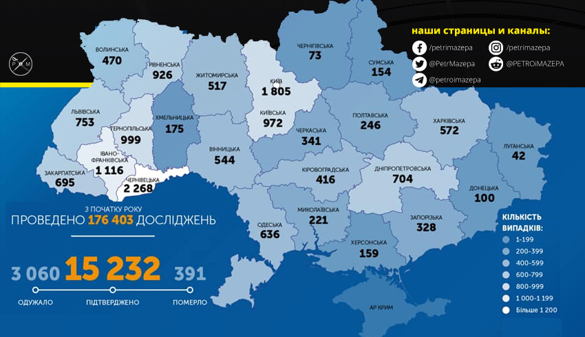 По состоянию на сегодняшнее утро в Украине зафиксировано 15232 случая COVID-19, за сутки прирост составил 522 случая, из них 30 детей и 110 медицинских сотрудника, 134 человека госпитализировано, 15 человек скончалось. Всего за весь срок пандемии скончалось 391 человек, выздоровело 3060 человек.