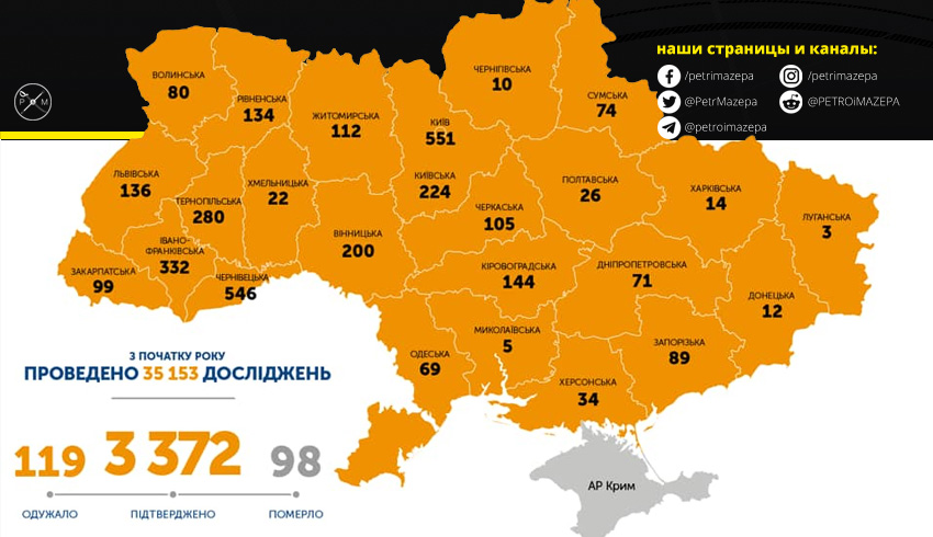 За вчерашний день в Украине было зафиксировано 270 новых случаев заражения COVID-19, всего число заболевших составляет 3372 человека. На амбулаторном лечении находится 1907 человек, госпитализировано 1248 больных, из них 52 детей, на аппарате ИВЛ находится 4 человека. За вчерашний день выздоровело 4 человека, всего число выздоровевших составляет 119 человек, погибло пятеро, и число погибших уже достигло 98 человек. 86% погибших – люди старше 50-ти лет.