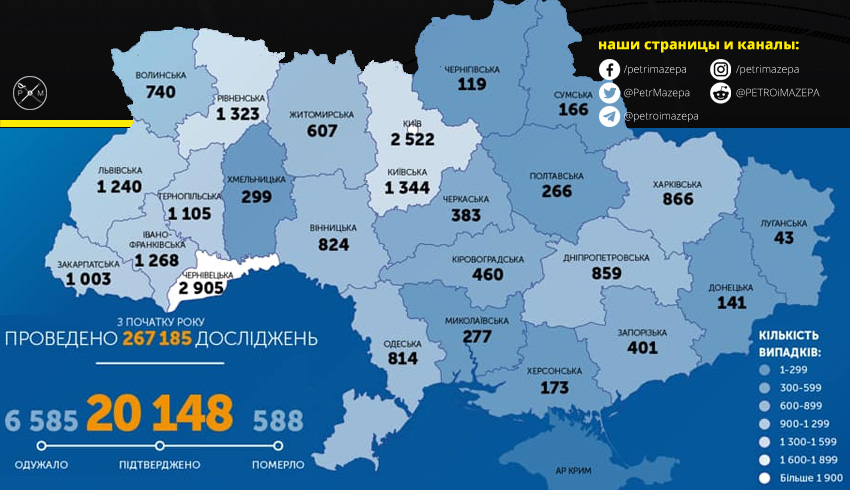 По данным ЦОЗ, за сутки в Украине было зафиксировано 442 новых случая COVID-19, всего за все время эпидемии число заболевших составило 20148 человек. Из них 588 человек скончалось, а 6585 человек выздоровело. Проведено за сутки 8923 ПЦР-тестирования.