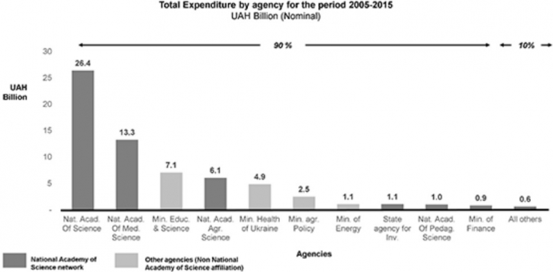 – недостаточного, неэффективного и предвзятого финансирования научного сектора. Более половины бюджетного финансирования сферы получает Национальная академия наук, оказывающая очень небольшой эффект на реальные рыночные инновации, тогда как университетский R&D в стране играет очень малую роль;