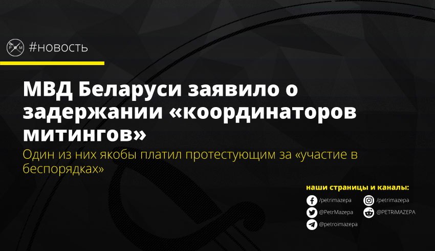 МВД Беларуси сообщило о задержании «координаторов протестов». Уточняется, что один из задержанных по данным МВД руководил протестующими из номера в отеле «Беларусь», а второй имел при себе 10 тысяч долларов, якобы предназначенных для выплат участникам акций протеста.