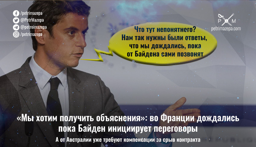 В интервью французскому новостному агентству BFM TV пресс-секретарь президента Эммануэля Макрона Габриэль Атталь сообщил о том, что на следующей неделе между президентом Франции и президентом США состоятся телефонные переговоры по поводу срыва контракта на поставку подводных лодок Австралии. А от самой Австралии во Франции уже ждут компенсации.