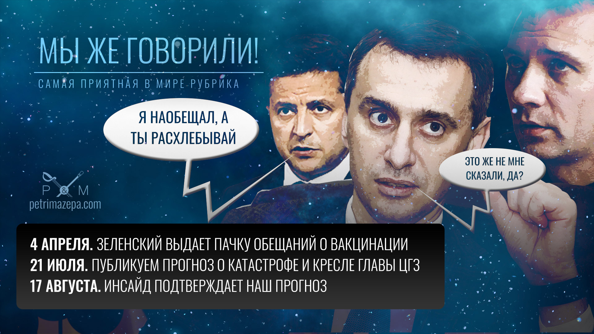 Для начала он наобещал к концу лета вакцинировать столько украинцев, что до конца года не вакцинируешь. Затем он (уже устами подручных) пообещал всем Pfizer в сезон отпусков. Как вы поняли, в основном наш гарант обещал — а вот делать должны были совершенно другие люди.