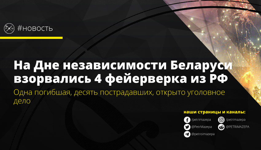 Во время празднования Дня независимости Беларуси взорвались снаряды праздничного салюта. Один человек погиб, десять пострадали, в соседних домах выбило стекла. По факту взрыва проводится проверка, но в Минобороны уже заявили, что салютные установки, как и снаряды, были закуплены в РФ, а вероятной причиной взрыва назвали плохое качество снарядов этого калибра. По данным СМИ, российские в фейерверках – только этикетки и документы, сделаны они были в Китае.