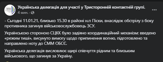 «Сегодня 11.01.21, около 15:30 в районе н.п Пески, в результате обстрела со стороны противника погиб военнослужащий ВСУ», - говорится на странице делегации в ТКГ.