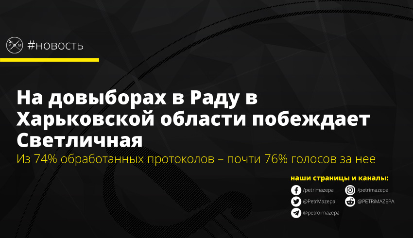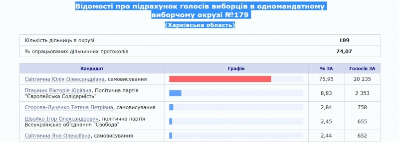 На довыборах в Раду в 179-м округе в Харьковской области побеждает самовыдвиженка Юлия Светличная. Обработано чуть меньше 75% бюлетеней.