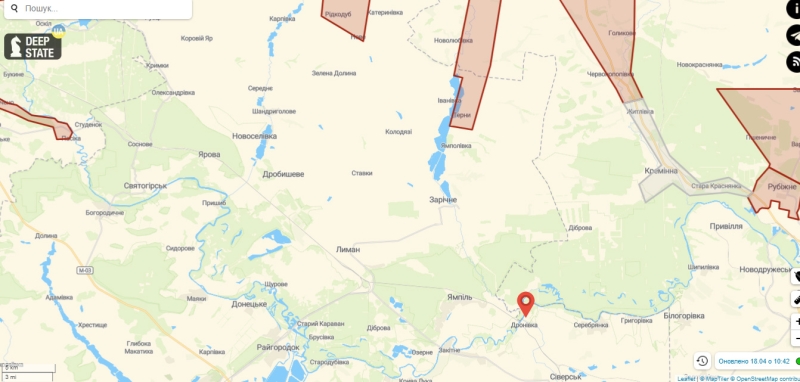 Данная местность, согласно данным карты от DeepState, расположена в нескольких десятках километров от линии фронта. Но к ней тянутся щупальца наступления оккупантов как со стороны Изюма с северо-запада, так и от Рубежного с северо-востока.