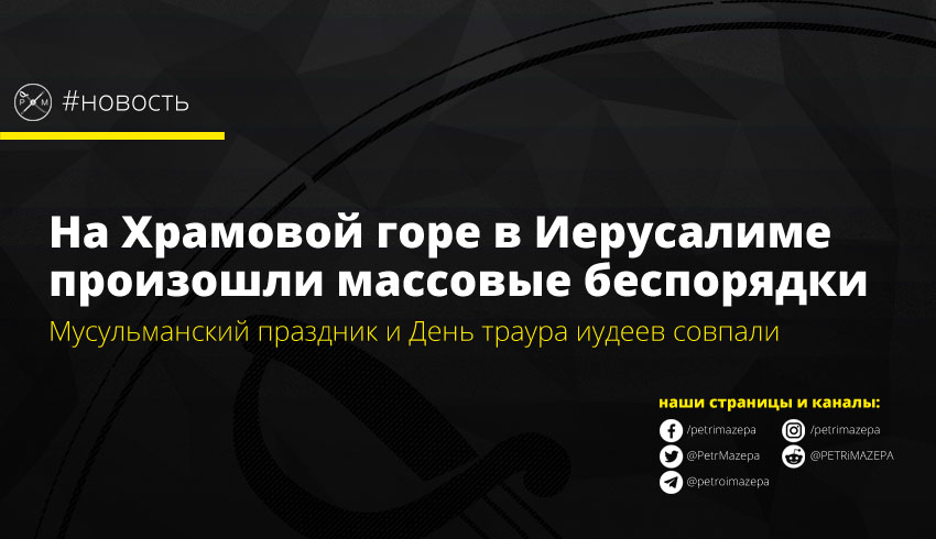 На Храмовой горе в Иерусалиме произошли массовые волнения, которые закончились столкновениями с полицией. Были применены светошумовые гранаты и слезоточивый газ, четверо полицейских пострадали. Причина – в том, что день траура иудеев совпал с праздником мусульман,  когда иудеи хотели провести акцию на Храмовой горе, а мусульмане выступали против доступа не-мусульман в священное для них место.