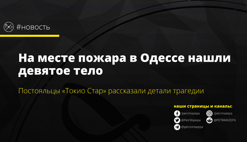 ГСЧС сообщает, что на месте пожара в центре Одессы в гостинице «Токио Стар», было найдено еще одно тело. Теперь количество погибших возросло до девяти. Также появились свидетельства постояльцев, что несмотря на наличие пожарной сигнализации, сирены не было, а пожарные приехали только через 20 минут и действовали неэффективно.
