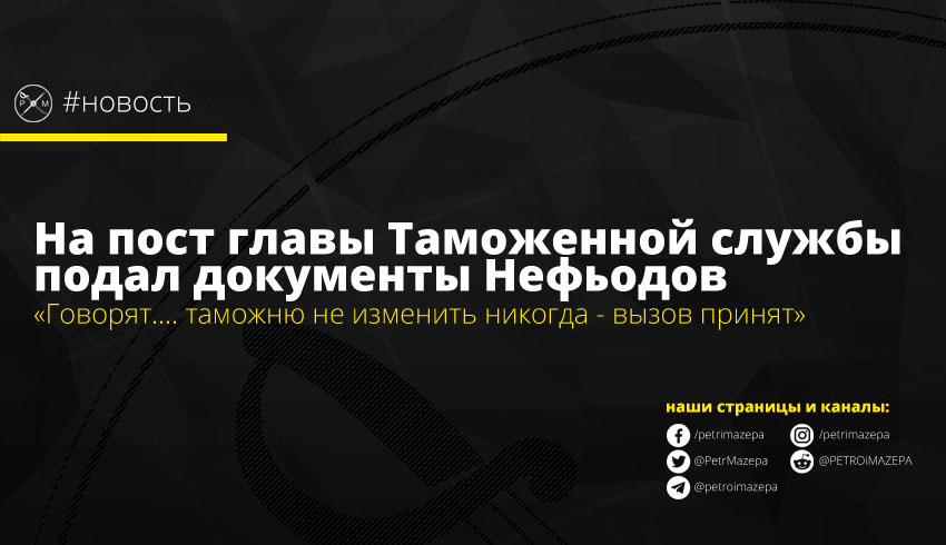 Об этом замминистра сообщил в Facebook, выложив фото из здания Национального агентства по вопросам государственной службы. На снимке запечатлен пакет документов, с надписью «Нефьодов Максим Евгеньевич. Кандидат на должность главы таможенной службы Украины».
