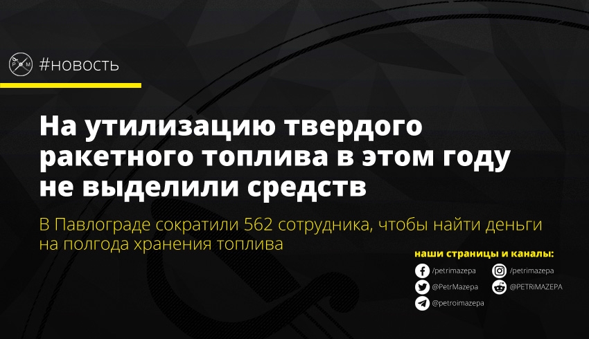 На Павлоградском химзаводе прошли массовые сокращения и остановлен процесс по утилизации старого ракетного топлива. Это произошло из-за недофинансирования программы по утилизации твердого ракетного топлива (ТРТ). Массовые увольнения позволили продлить срок хранения опасных отходов на полгода.