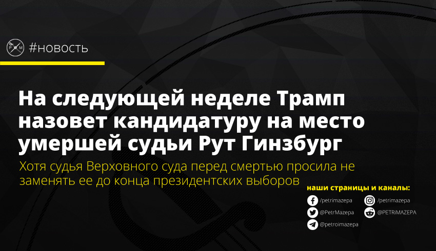 Президент США Дональд Трамп сообщил, что на следующей неделе определится с кандидатурой на освободившееся место судьи Верховного суда. Одно из девяти мест освободилось после смерти в пятницу Рут Гинзбург (в США на эту должность назначают пожизненно). По данным СМИ, перед смертью Гинзбург просила не заменять ее, пока не закончатся выборы.